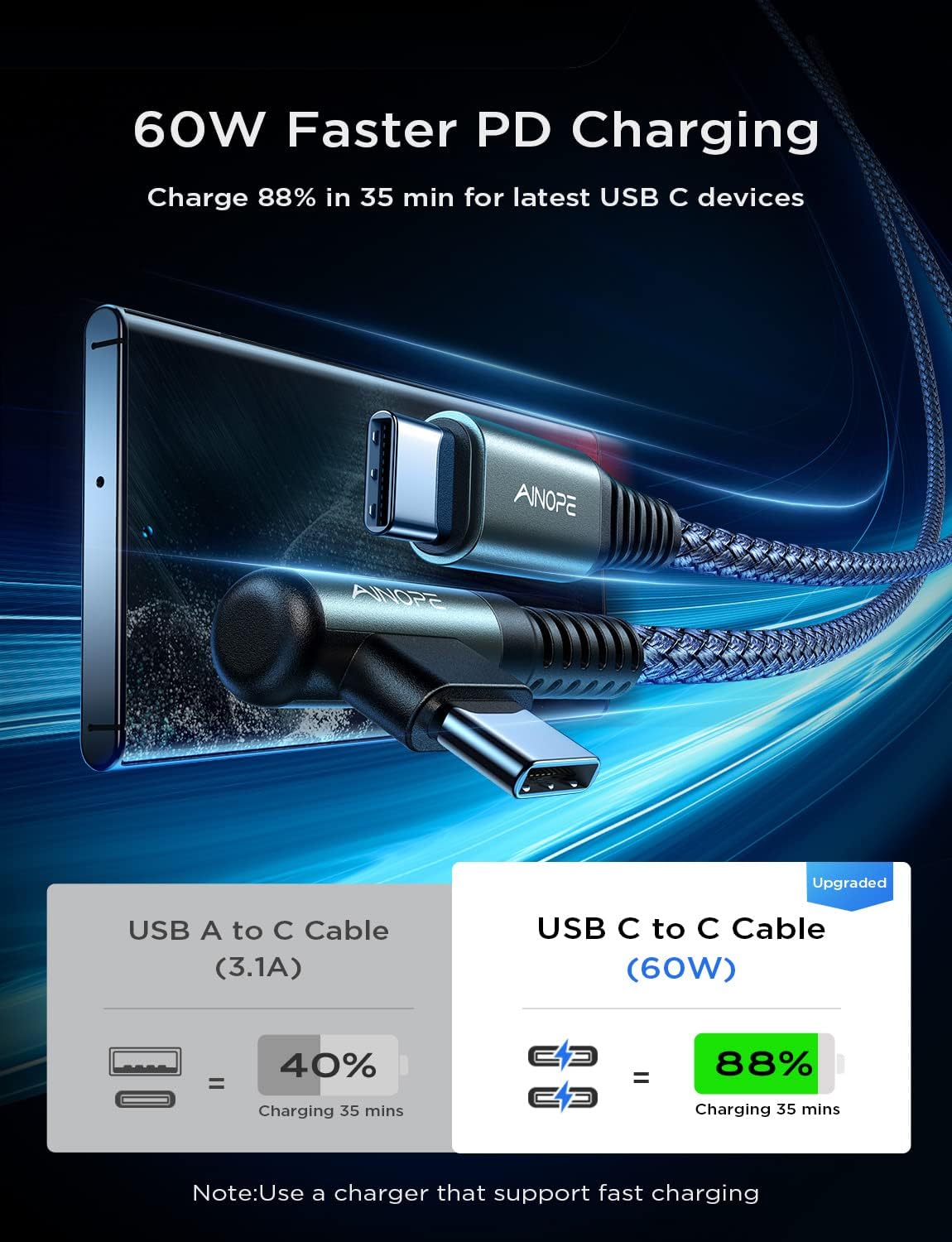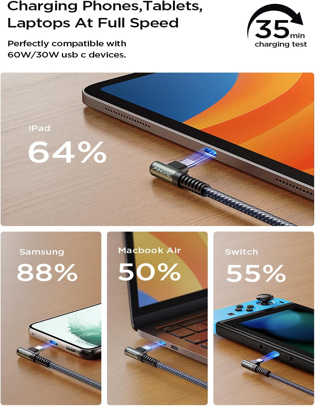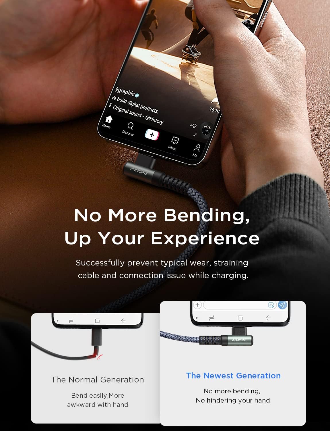 Ергономічний дизайн успішно запобігає типовим проблемам зі зносом, натягом кабелю та підключенням, продовжуючи термін служби зарядного кабелю. Насолоджуйтесь швидкою зарядкою та зручністю навіть у найтіснішому куточку.