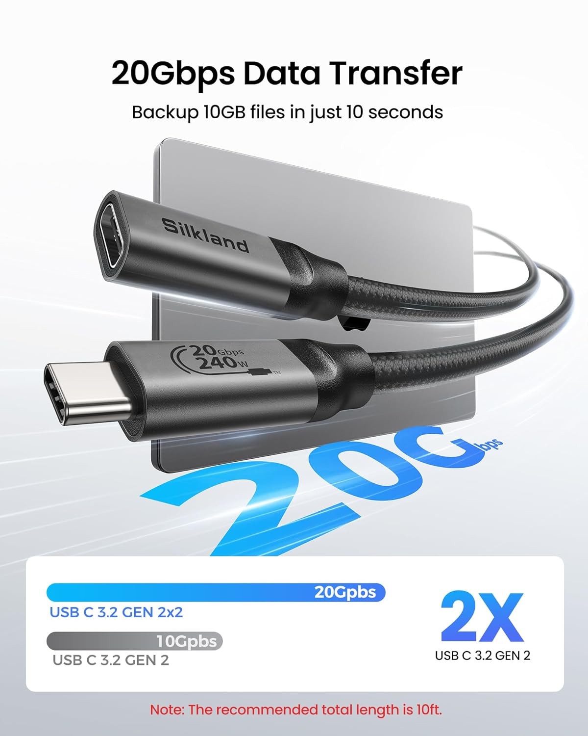 [20 Гбіт/с передачі даних] Цей подовжений кабель USB C сумісний з USB 3.2 Gen 2 і може швидко передавати або отримувати фільми HD, аудіо та відеосигнали 4K, створювати резервні копії файлів розміром 10 ГБ менше ніж за 10 секунд. Підтримує підключення концентратора USB C, док-станції, SSD та інших пристроїв з портом USB C. Примітка: Якщо швидкість передачі обмежена, перевірте максимальну швидкість передачі, підтримувану вашим пристроєм.