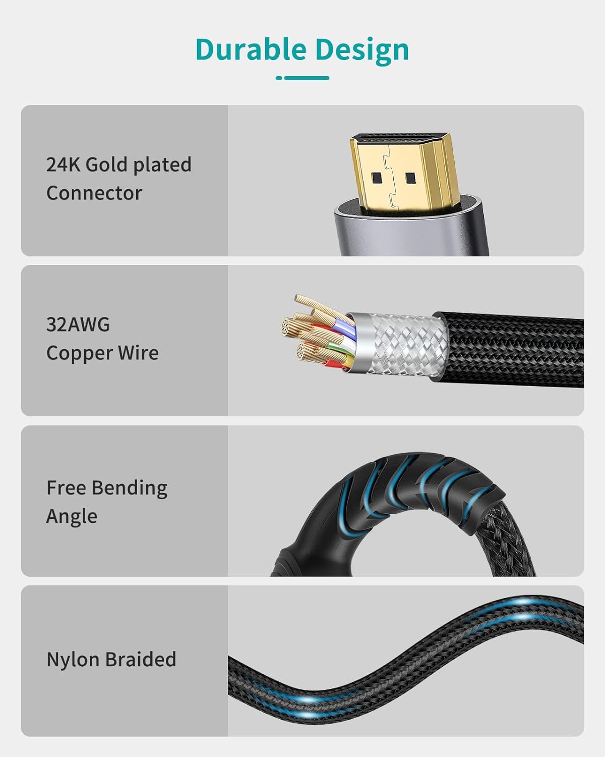 【Відмінна якість та надміцність】 Мідний провід 32AWG, потрійне екранування ефективно захищає від електромагнітних перешкод, забезпечуючи більш стабільну передачу сигналу. Позолочені роз’єми 24 карати та алюмінієвий корпус, багаторазове екранування мінімізують перешкоди. Нейлонова плетена дріт витримує вигини понад 30 000+/180 градусів.
