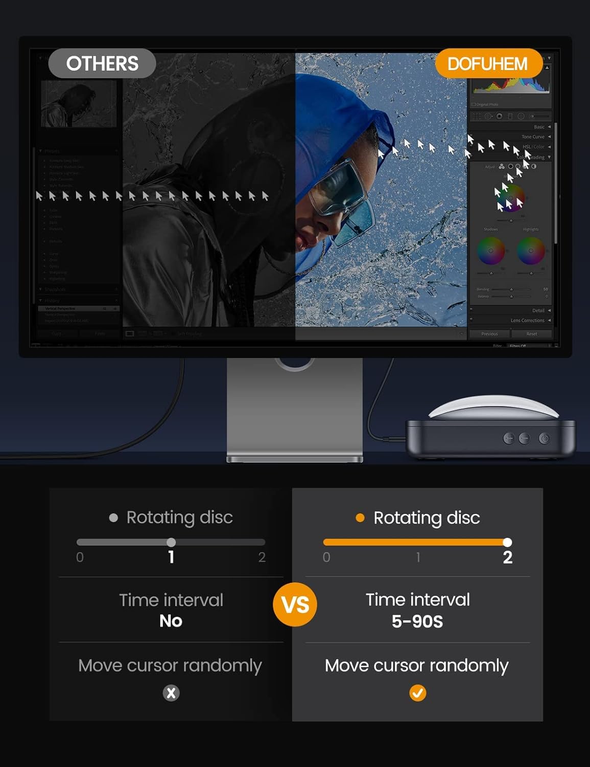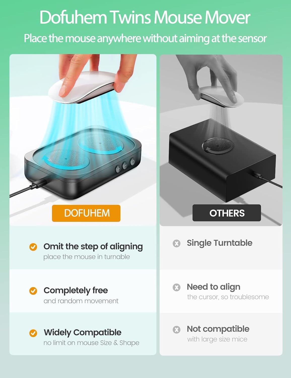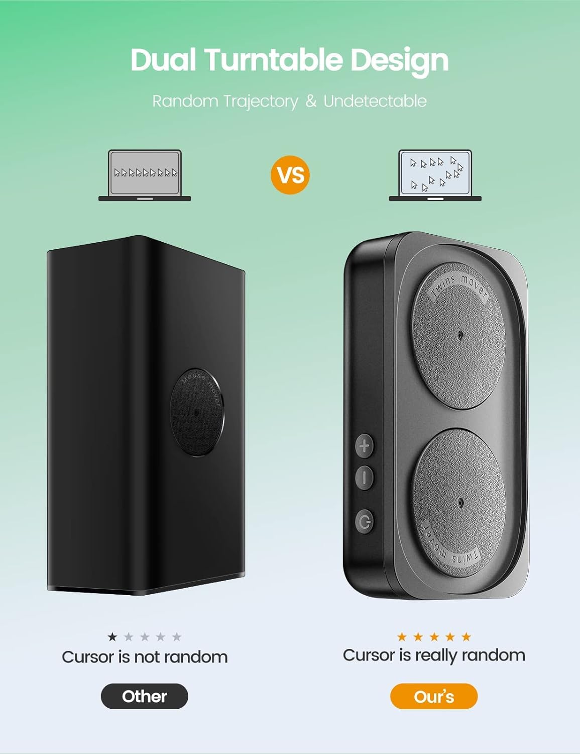 [Twin Mover] Невиявлений Mouse Mover із двома поворотними столами має змішану фізичну конструкцію. При використанні поворотний стіл вгору і вниз рухається разом з максимальною швидкістю, що забезпечує повну посадку миші на нього на 360 градусів, щоб імітувати рух миші. Завдяки різним силам тертя у різних положеннях миші створюється більш реалістична траєкторія руху. Він використовує повніший фізичний контакт з мишею, щоб змусити мишу рухатися більш хаотично, на відміну від інших пристроїв.