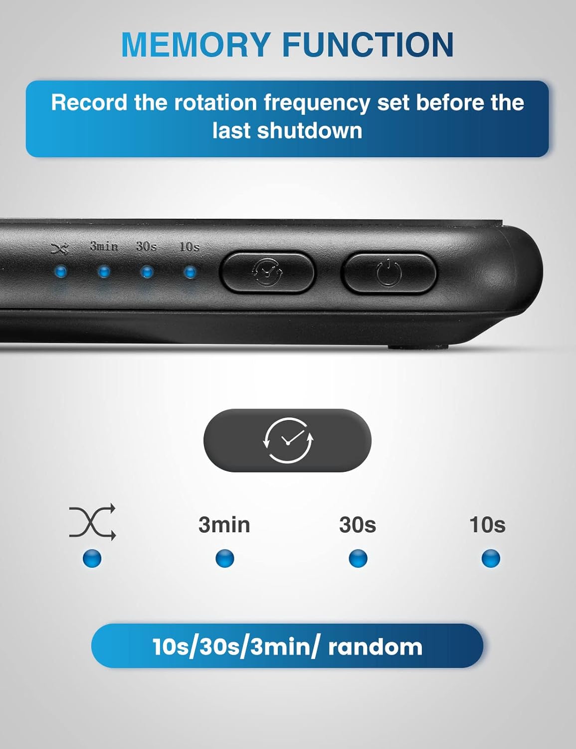 [Довільний часовий інтервал] Має регульований інтервал часу, і чотири налаштування: 10 с/30 с/3 хв/1–60 с. Четверте налаштування дозволяє перемикатися випадково в межах 1–60 секунд. Поворотний стіл працює щоразу близько 50 секунд, потім зупиняється відповідно до інтервалу та продовжує працювати після паузи.