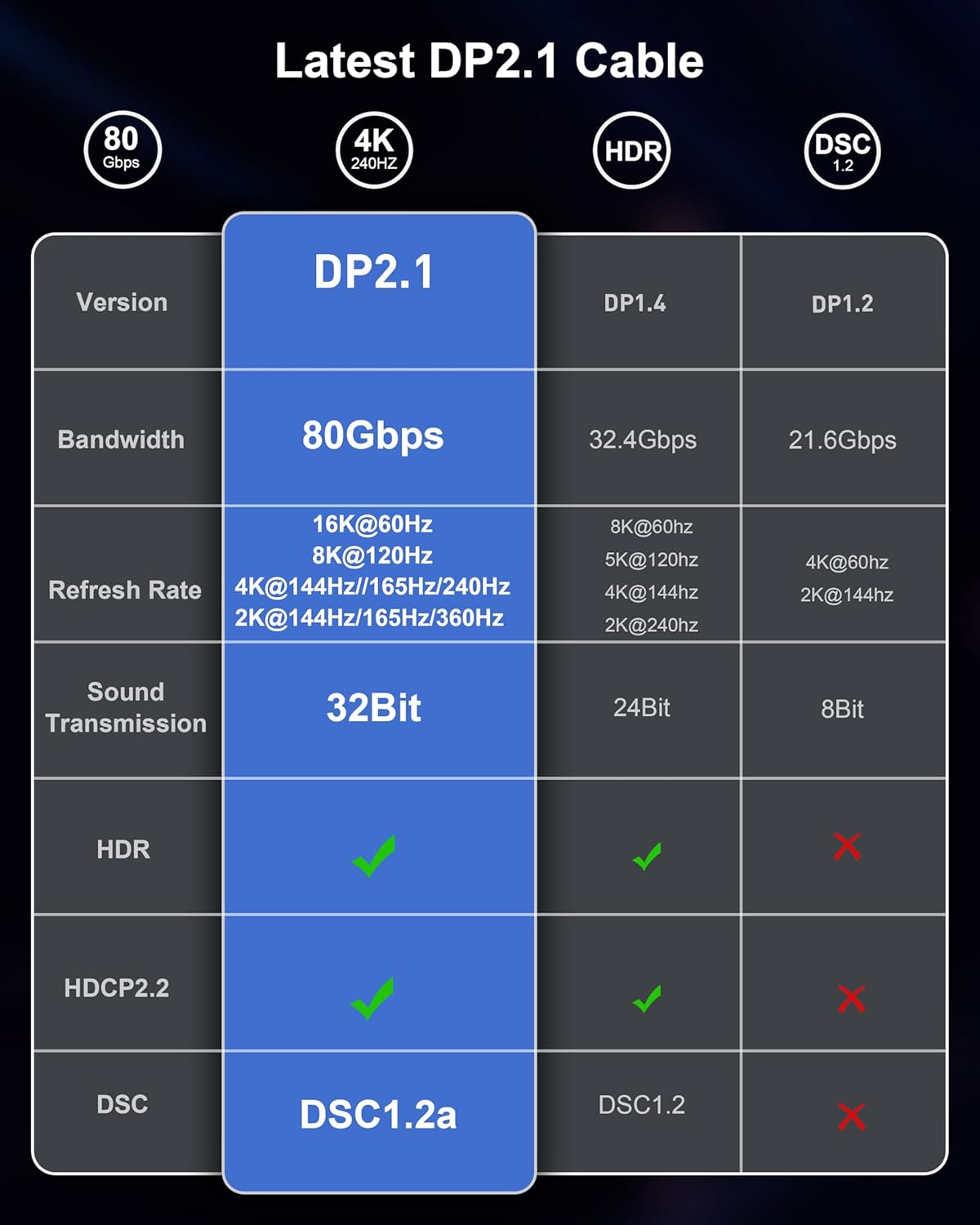 [Високошвидкісний кабель DISPLAYPORT 2.1]: ВИСОКИЙ ДОЗВІЛ Функція Displayport 2.1 16K забезпечує пропускну здатність 80 Гбіт/с. Стабільна та високошвидкісна передача без втрати сигналу. Відповідає стандарту VESA та підтримує динамічний HDR 4:4:4/HDR 10 та HDCP 2.2. Підключи та грай. Працює з DP, DP++ та DisplayPort++.