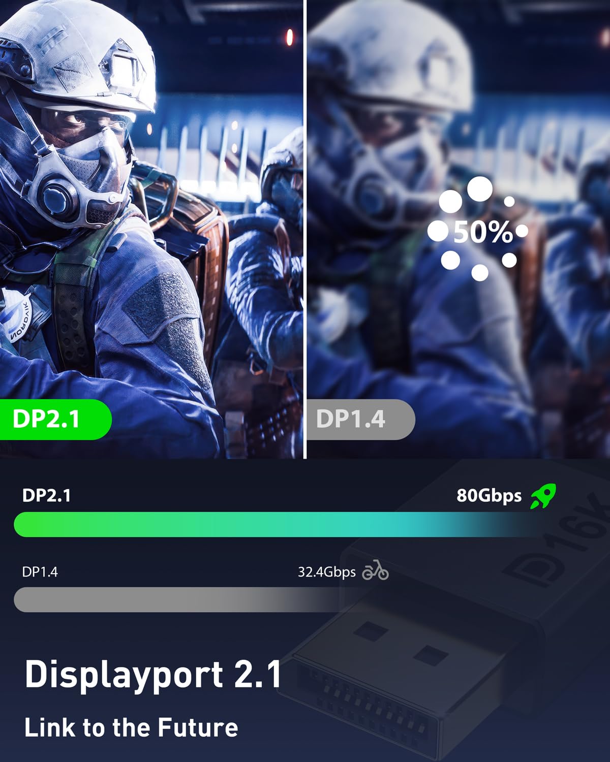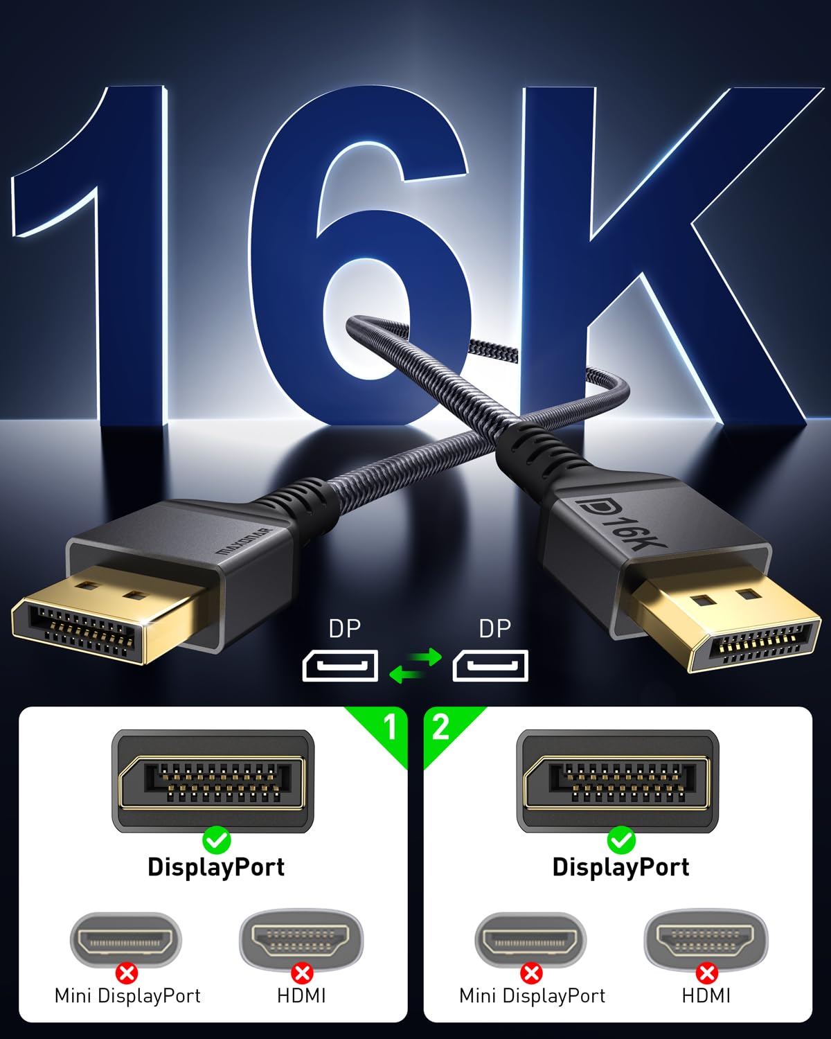 [Надійний захист від перешкод]: наш кабель DisplayPort 2.1 виготовлений із лудженої міді товщиною 28AWG з тришаровим екрануванням для стабільної передачі відео- та аудіосигналів. Якісна нейлонова плетена оболонка з терміном служби понад 30 000 вигинів забезпечує надміцний кабель DisplayPort-DisplayPort. Позолочені роз’єми 24К не тьмяніють і не знижують провідність з часом.