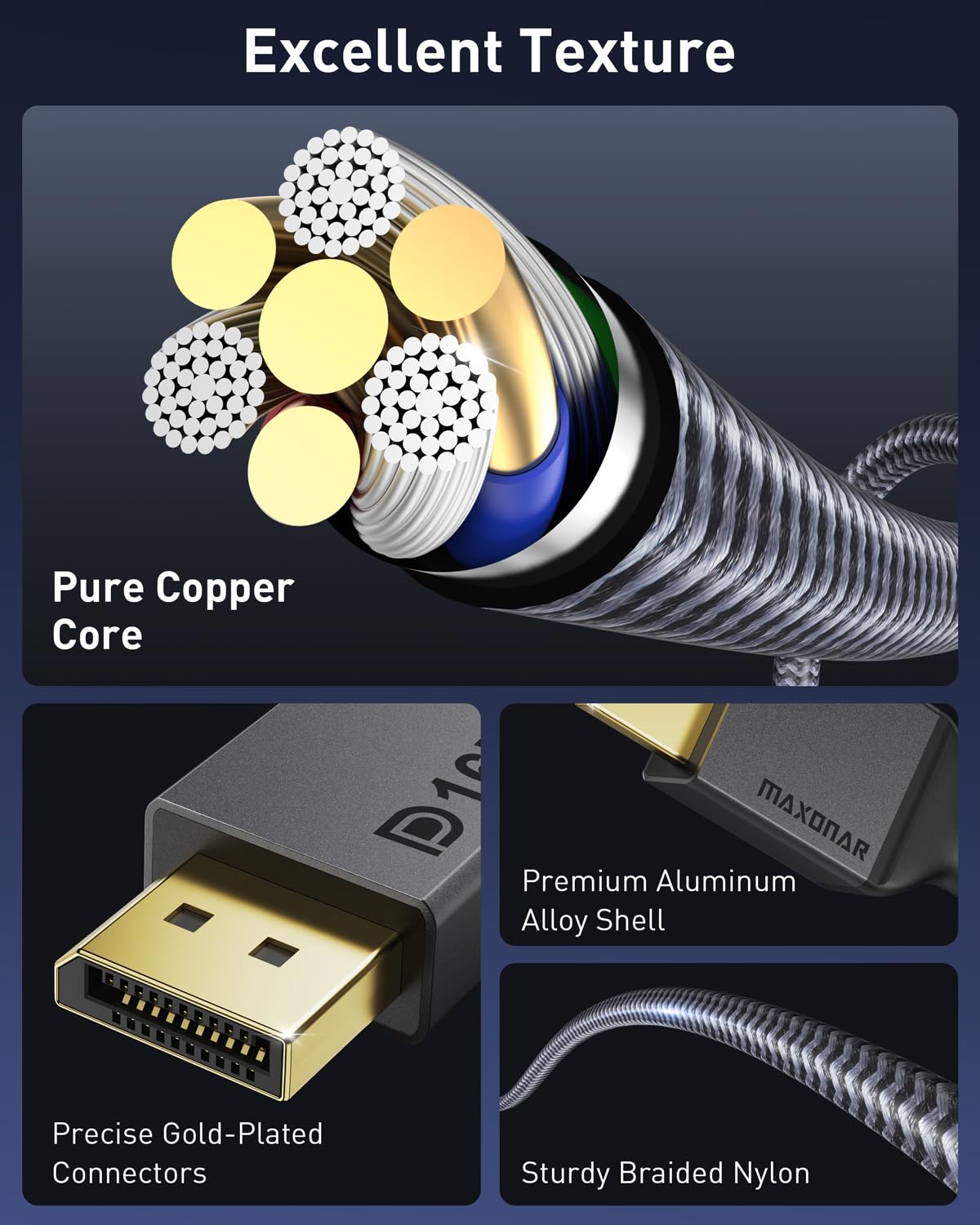 [МАКСИМАЛЬНА ПРОДУКТИВНІСТЬ — зручність для геймерів]: кабель Maxonar Displayport підтримує роздільну здатність до 16K (15 360×8460), включаючи 8K (7680×4320), 5K (5120×2880 при 60 Г2 та 1080P (Full HD) Ідеально підходить для великих ігор та потокової передачі відео у форматі Ultra HD. Переклад плавнішого і приємнішого ігрового процесу, який дасть вам перевагу в інтенсивних іграх.