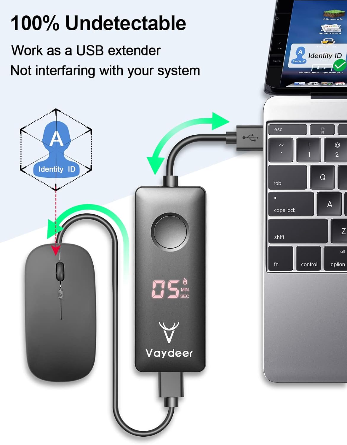 [100% невидимість]: Схожий на подовжувач USB, він використовується тільки для розширення з’єднання. Тому комп’ютер не розпізнає нічого, крім USB-порту, і розпізнаватиме маніпулятор як звичайну мишу при підключенні до нього. Вам більше не потрібно турбуватися про ІТ-відділ.